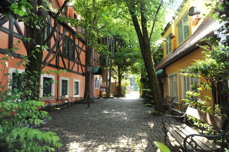 中世ヨーロッパ・ドイツの街並みを想わせる石畳の中庭と洋館、19世紀ウィーン風のコンサートホールやレストランなど、都心にいながらヨーロッパの雰囲気を撮影いただけます。